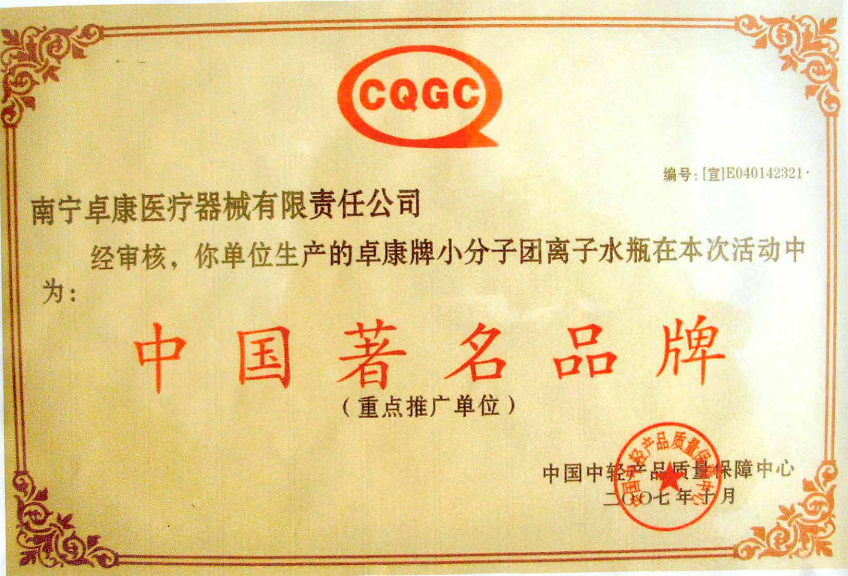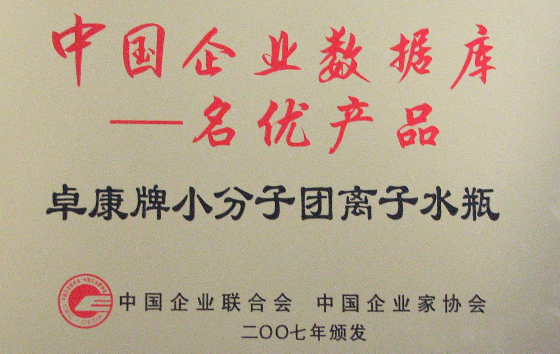 卓康牌離子水瓶榮獲中國(guó)企業(yè)名優(yōu)產(chǎn)品[點(diǎn)小圖見大圖]、中國(guó)著名品牌稱號(hào)[點(diǎn)小圖可見大圖]